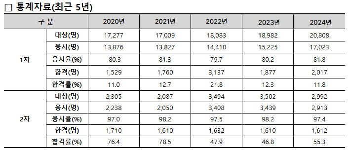 주목해야 할 부분은 2020년 도입된 상대평가제입니다. 이 제도는 고정 커트라인이 아닌 상위 성적자 위주로 합격자를 선발하기 때문에, 절대 점수 달성만으로는 합격이 보장되지 않습니다. 실제로 2020년 1,710명에서 2022년 이후 1,610-30명으로 합격자 수가 점차 안정화되며 경쟁이 치열해졌습니다. 또한, 1차 합격자는 다음 해까지 2차 시험 응시 자격이 주어지기 때문에, 2차 높은 합격률이 시험 자체의 쉬움을 의미하지는 않습니다. 동차 합격(1차·2차 동년도 합격)의 경우, 2차 합격률이 높아도 1차 준비에 집중해야 하는 부담으로 인해 실제 성공률은 낮은 편입니다. 반면 1차 합격 후 2차 재응시자는 이미 기본기를 갖춘 상태라 합격률이 70% 이상으로 높게 나타납니다. 따라서 현실적인 전략은 1차 집중 학습, 2차 실전 대비 단계를 거치는 것이 효과적입니다.