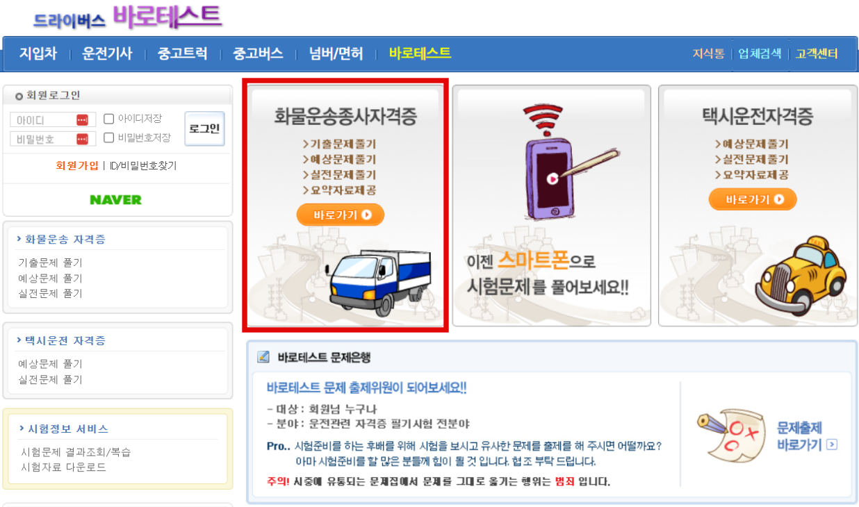 웹사이트에 접속하시면 홈페이지 화면 중간에 화물운송종사자자격증이라는 메뉴를 보실 수 있습니다. 안내가 나와있듯이 기출문제, 예상문제등을 풀어보실 수 있는데요, 버스운전 자격시험이 아닌 화물운송종사자 자격증이라고 의아해하실 수도 있습니다.