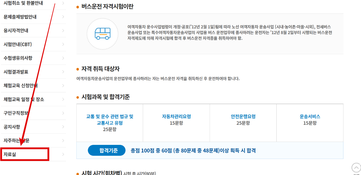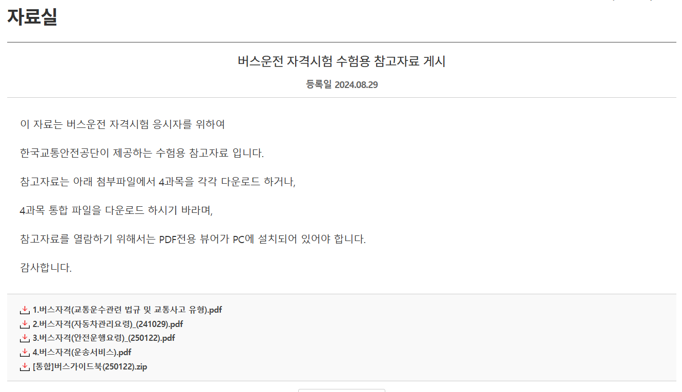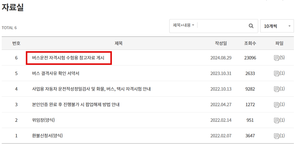 그러면 자료실 화면을 보실 수 있습니다. 거기서 작년에 업데이트된 버스운전 자격시험 수험용 참고자료를 찾아 실 수 있습니다. 해당 자료를 클릭해 주세요.