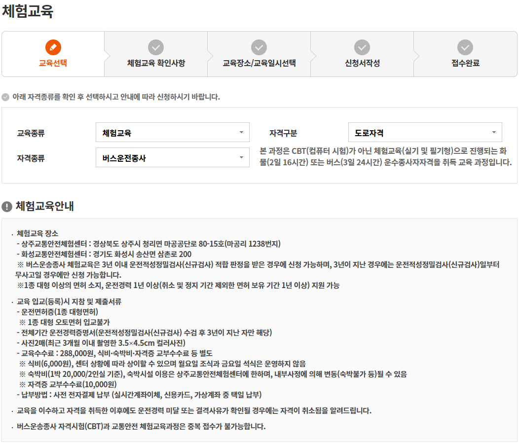 시험 없이 버스운전 자격증을 취득할 수 있다는 점은 장점이긴 하지만, 생각보다 비용이 많이 드는 교육이긴 합니다. 교육수수료가 28만 8천 원으로 적지 않고 식비와 숙박비도 별도이기 때문에 이를 고려하면 4-50만 원의 비용이 들게 되는 것이죠.